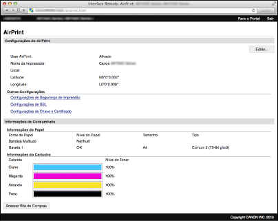 Pode ver o ecrã do AirPrint que lhe permite não só aceder às definições do AirPrint como, também, ver as informações relativas aos consumíveis, tais como o papel e as cartridges de toner. Também pode configurar as definições de segurança (
