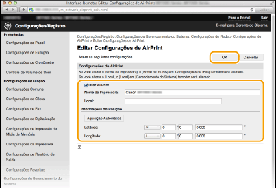Introduza o nome e o local de instalação para o ajudar a identificar a máquina quando utilizar o dispositivo Apple. Essas informações são úteis no caso de ter mais de uma impressora com AirPrint.