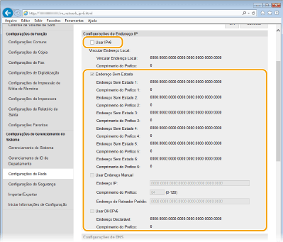 Os endereços IPv6 da máquina podem ser configurados através da UI Remota. Antes de definir endereços IPv6, verifique as definições de endereço IPv4 (Ver as definições de IPv4). É necessário configurar as definições corretas de IPv4 para poder utilizar endereços IPv6. Tenha em atenção que a função de digitalização que utiliza o controlador de scanner ou o MF Scan Utility não está disponível no ambiente IPv6. A máquina pode utilizar até um máximo de nove dos seguintes endereços IPv6: