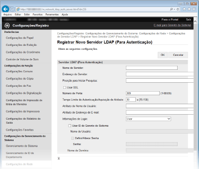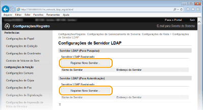 Clique em [Registrar Novo Servidor] para [Servidor LDAP (Para Pesquisa)] ou [Servidor LDAP (Para Autenticação)].