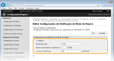 Selecione a caixa de verificação para notificar um software de gestão de dispositivos relativamente ao estado de energia da máquina. Se selecionar [Notificar], a máquina evitará comunicações desnecessárias durante o modo Sleep e reduzirá o consumo total de energia. [Número de Porta]