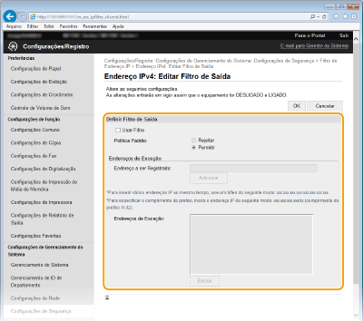 Se os endereços IP não forem introduzidos corretamente, poderá não conseguir aceder à máquina a partir da UI Remota; nesse caso, será necessário definir <Filtro de Endereço IPv4> ou <Filtro de Endereço IPv6> como <Desativado>. Filtro de Endereço IPv4 Filtro de Endereço IPv6