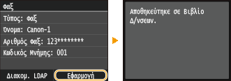 Σύμφωνα με το καταχωρισμένο περιεχόμενο στο διακομιστή LDAP, το όνομα χρήστη και ο αριθμός φαξ/η διεύθυνση e-mail του καθορισμένου προορισμού που έχει καταχωριστεί στον διακομιστή LDAP θα εισαχθούν αυτόματα