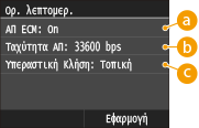 Μπορείτε, επίσης, να καθορίσετε τις ρυθμίσεις <ΑΠ ECM> και <Ταχύτητα ΑΠ> επιλέγοντας <Μενού>  <Ρυθμίσεις Φαξ>. Ωστόσο, στην ενότητα <Βιβλίο Δ/νσεων> μπορείτε να κάνετε λεπτομερείς ρυθμίσεις μόνο για τους προορισμούς που έχουν ήδη καταχωρηθεί στο Βιβλίο διευθύνσεων.