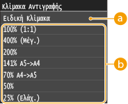 Μπορείτε να μεγεθύνετε ή να σμικρύνετε τα αντίγραφα χρησιμοποιώντας μια ειδική κλίμακα αντιγραφής, όπως η <A5->A4>, ή ρυθμίζοντας μια ειδική κλίμακα αντιγραφής σε βήματα του 1%.
