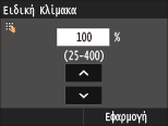 ή χρησιμοποιήστε τα αριθμητικά πλήκτρα για να εισαγάγετε την κλίμακα αντιγραφής και πατήστε <Εφαρμογή>. Μπορείτε να ορίσετε οποιαδήποτε κλίμακα αντιγραφής από 25% έως 400% σε προσαυξήσεις 1%.