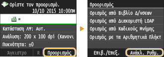 Εάν η ρύθμιση <Απαγόρ. Επαναπ/λής από Ημερολ.> έχει οριστεί σε <On>, δεν μπορείτε να χρησιμοποιήσετε αυτή τη λειτουργία. Απενεργοποίηση χρήσης προορισμών που έχουν χρησιμοποιηθεί προηγουμένως
