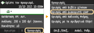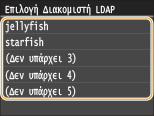 Αν στο γραφείο σας υπάρχει εγκατεστημένος διακομιστής LDAP, μπορείτε να χρησιμοποιήσετε τους προορισμούς που είναι καταχωρισμένοι στο διακομιστή. Για να καθορίσετε προορισμούς, εισέλθετε σε ένα διακομιστή LDAP μέσω της συσκευής και αναζητήστε έναν προορισμό.