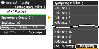 Μπορείτε να καταχωρήσετε έως 18 συνδυασμούς ρυθμίσεων φαξ που χρησιμοποιείτε συχνά. Έτσι, έχετε τη δυνατότητα να βλέπετε άμεσα τις καταχωρημένες ρυθμίσεις, όταν τις χρειάζεστε, χωρίς να πρέπει να τις επαναλαμβάνετε κάθε φορά, π.χ. να σαρώνετε ένα πρωτότυπο δύο όψεων, να το στέλνετε σε 5 προορισμούς και να ορίζετε την ευκρίνεια. Επίσης, μπορείτε να βλέπετε τις ρυθμίσεις ως πλήκτρα συντόμευσης στην <Αρχική> οθόνη.
