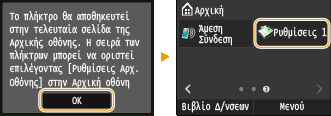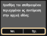 Εάν επιλέξετε <Ναι>, θα εμφανιστεί ένα μήνυμα. Διαβάστε το μήνυμα και έπειτα πατήστε <OK>. Ο συνδυασμός των καταχωρημένων ρυθμίσεων θα προστεθεί στην <Αρχική> οθόνη ως πλήκτρο συντόμευσης.