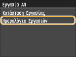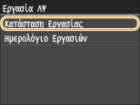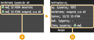 ![]() <Κατάσταση Εργασιών ΑΠ>/<Κατάσταση Εργασιών ΛΨ>Εμφανίζει μια λίστα των εγγράφων που αποστέλλονται και λαμβάνονται ή βρίσκονται σε αναμονή για επεξεργασία.
