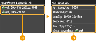 ![]() <Ημερολόγιο Εργασιών ΑΠ>/<Ημερολόγιο Εργασιών ΛΨ>Εμφανίζει μια λίστα των εγγράφων που έχουν αποσταλεί και ληφθεί. Όταν η αποστολή ή η λήψη ενός εγγράφου έχει πραγματοποιηθεί με επιτυχία, εμφανίζεται το μήνυμα <OK> και όταν η αποστολή ή η λήψη ενός εγγράφου έχει αποτύχει επειδή ακυρώθηκε ή παρουσιάστηκε σφάλμα, εμφανίζεται το μήνυμα <Σφάλμα>.