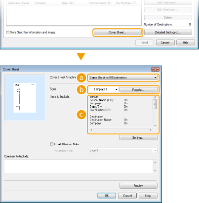 Μπορείτε να επισυνάψετε ένα συνοδευτικό φύλλο στο έγγραφο που αποστέλλετε. Επιλέξτε ένα συνοδευτικό φύλλο από τα τρία προκαθορισμένα συνοδευτικά φύλλα στο πρόγραμμα οδήγησης φαξ ή δημιουργήστε τα δικά σας προσαρμοσμένα συνοδευτικά φύλλα. Για περισσότερες πληροφορίες, κάντε κλικ στο [Help] (Βοήθεια) στην οθόνη του προγράμματος οδήγησης φαξ.