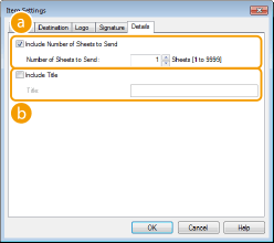 Επιλέξτε αυτό το πλαίσιο ελέγχου εάν θέλετε να συμπεριληφθεί ο αριθμός των φύλλων που θα αποστείλετε στο συνοδευτικό φύλλο και καθορίστε των αριθμό των φύλλων στο πλαίσιο [Number of Sheets to Send] (Αριθμός φύλλων αποστολής). Ο αριθμός των φύλλων για αποστολή δεν μετριέται αυτόματα. Η τιμή που καθορίζετε εδώ συμπεριλαμβάνεται στο συνοδευτικό φύλλο.