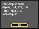 Ελέγξτε ότι το μέγεθος και ο τύπος χαρτιού που εμφανίζονται στην οθόνη συμφωνούν με τα αντίστοιχα χαρακτηριστικά του χαρτιού που έχετε τοποθετήσει στη συσκευή και πατήστε <OK>.