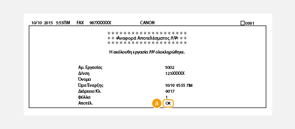 Μπορείτε να ελέγξετε τα ημερολόγια των ληφθέντων εγγράφων φαξ και I-Fax εκτυπώνοντας μια αναφορά αποτελέσματος λήψης. Η αναφορά μπορεί να εκτυπώνεται είτε κάθε φορά που ολοκληρώνεται μια μετάδοση ή μόνο όταν προκύπτει σφάλμα λήψης.