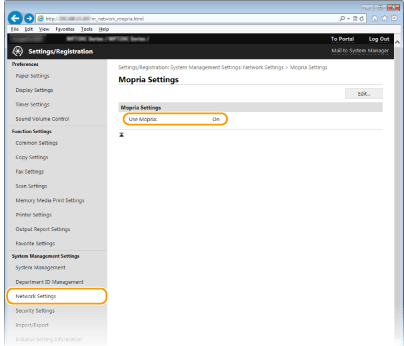 Συνδεθείτε στο Remote UI (Απομακρυσμένο περιβάλλον εργασίας) στη λειτουργία υπεύθυνου συστήματος ( Εκκίνηση του Remote UI (Απομακρυσμένο περιβάλλον εργασίας))  [Settings/Registration]  [Network Settings]  [Mopria Settings]  [Edit]  Βεβαιωθείτε ότι το πλαίσιο ελέγχου [Use Mopria] είναι επιλεγμένο  [OK]
