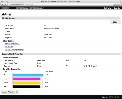 Μπορείτε να εμφανίσετε την οθόνη AirPrint, μέσω της οποίας έχετε πρόσβαση στις ρυθμίσεις AirPrint, καθώς επίσης και να προβάλετε πληροφορίες σχετικά με τα αναλώσιμα, όπως το χαρτί και οι κασέτες γραφίτη. Επίσης, μπορείτε να διαμορφώσετε τις ρυθμίσεις της λειτουργίας ασφάλειας (