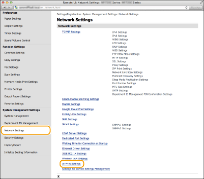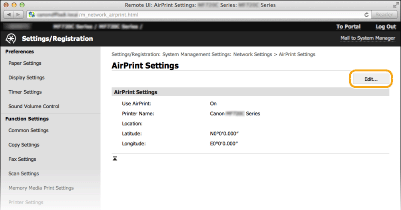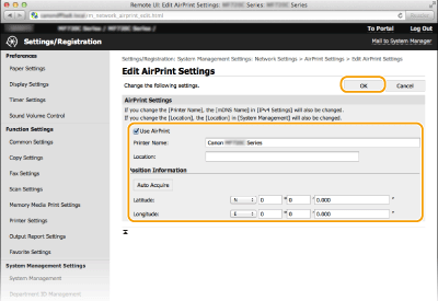 Μπορείτε να καταχωρήσετε τις πληροφορίες, συμπεριλαμβανομένων του ονόματος της συσκευής και της τοποθεσίας εγκατάστασης, που χρησιμοποιούνται για την ταυτοποίηση της συσκευής. Επίσης, μπορείτε να απενεργοποιήσετε τη λειτουργία AirPrint στη συσκευή. Χρησιμοποιήστε το Remote UI (Απομακρυσμένο περιβάλλον εργασίας) για να αλλάξετε αυτές τις ρυθμίσεις.
