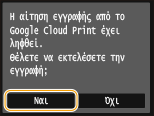 Μπορείτε επίσης να καταχωρήσετε τη συσκευή μέσω μιας φορητής συσκευής ή μέσω του Google Chrome. Πριν ολοκληρωθεί η καταχώρηση, στην οθόνη της συσκευής θα εμφανιστεί η παρακάτω οθόνη επιβεβαίωσης. Πατήστε <Ναι> για να ολοκληρώσετε την καταχώρηση.