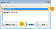 Στο πεδίο [Available port types] (Διαθέσιμοι τύποι θύρας), επιλέξτε [Canon MFNP Port] και κάντε κλικ στην επιλογή [New Port] (Νέα θύρα).