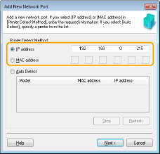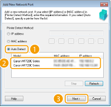 Κάντε κλικ στο [Refresh] (Ανανέωση). Εάν το πρόβλημα παραμένει, κάντε κλικ στο [IP address] (Διεύθυνση ΙΡ) ή στο [MAC address] (Διεύθυνση MAC), εισαγάγετε τη διεύθυνση IP ή τη διεύθυνση MAC του μηχανήματος Προβολή ρυθμίσεων δικτύου και, στη συνέχεια, κάντε κλικ στο [Next] (Επόμενο).
