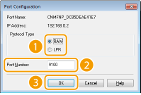 Κάντε κλικ στο κουμπί επιλογής [LPR] ή [RAW] στο [Protocol Type] (Τύπος πρωτοκόλλου), αλλάξτε τον αριθμό στο πλαίσιο κειμένου [Port Number] (Αριθμός θύρας), εάν χρειάζεται, και, στη συνέχεια, κάντε κλικ στο [OK].
