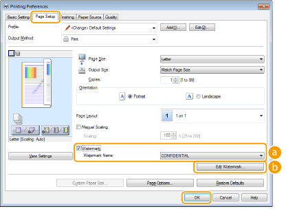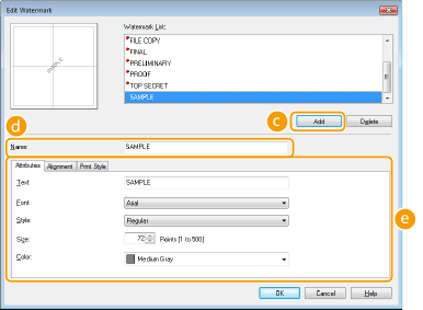 Κάντε κλικ σε κάθε καρτέλα για να καθορίσετε το κείμενο, το χρώμα ή την τοποθεσία εκτύπωσης του υδατογραφήματος. Για περισσότερες πληροφορίες, κάντε κλικ στην επιλογή [Help] (Βοήθεια) στην οθόνη του προγράμματος οδήγησης εκτυπωτή.