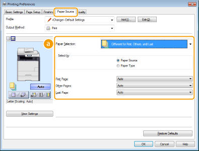 Επιλέξτε τις σελίδες που θέλετε να εκτυπώσετε σε διαφορετικό χαρτί και την πηγή χαρτιού όπου έχετε τοποθετήσει το συγκεκριμένο χαρτί στο πεδίο [Paper Selection] (Επιλογή χαρτιού)