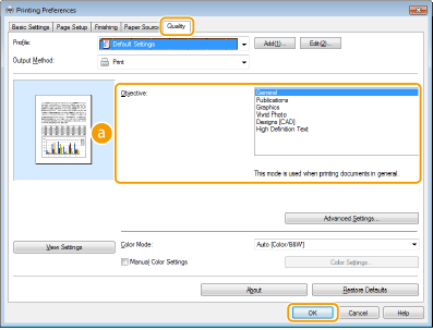 Για να καθορίσετε λεπτομερείς ρυθμίσεις για κάθε στοιχείο που έχει επιλεγεί στη ρύθμιση [Objective] (Αντικείμενο εκτύπωσης), κάντε κλικ στο [Advanced Settings] (Ρυθμίσεις για προχωρημένους). Για περισσότερες πληροφορίες, κάντε κλικ στην επιλογή [Help] (Βοήθεια) στην οθόνη του προγράμματος οδήγησης εκτυπωτή.