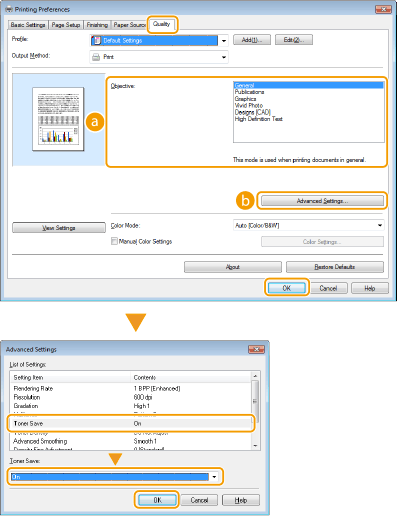 Μπορείτε να καθορίσετε εάν θα ενεργοποιήσετε τη ρύθμιση εξοικονόμησης γραφίτη για κάθε τύπο εγγράφου. Καθορίστε τη ρύθμιση εξοικονόμησης γραφίτη για κάθε τύπο εγγράφου που περιλαμβάνεται στο στοιχείο [Objective] (Αντικείμενο εκτύπωσης).