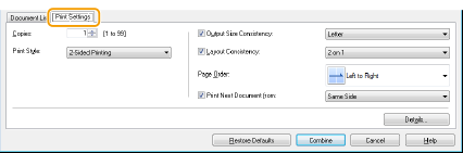 Κάντε κλικ στην καρτέλα [Print Settings] (Ρυθμίσεις εκτύπωσης) για να εμφανίσετε την οθόνη όπου θα καθορίσετε τις ρυθμίσεις εκτύπωσης, όπως τον αριθμό των αντιγράφων ή την εκτύπωση 1-όψης/2-όψεων. Οι ρυθμίσεις που καθορίζονται εδώ ισχύουν για όλη την εργασία εκτύπωσης.