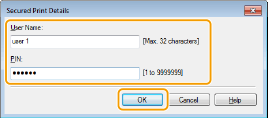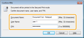 Εισαγάγετε τις σχετικές πληροφορίες στα πεδία [Document Name] (Όνομα εγγράφου), [User Name] (Όνομα χρήστη) και [PIN], και έπειτα επιλέξτε [OK].