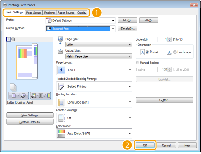 Κάντε κλικ στις καρτέλες [Basic Settings] (Βασικές ρυθμίσεις), [Page Setup] (Ρύθμιση σελίδας), [Finishing] (Τελική επεξεργασία), [Paper Source] (Πηγή χαρτιού) ή [Quality] (Ποιότητα) για να καθορίσετε τις ρυθμίσεις εκτύπωσης σε κάθε οθόνη, όπως απαιτείται.