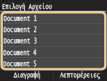 Εάν υπάρχουν στη μνήμη ασφαλή έγγραφα από δύο ή περισσότερους χρήστες, εμφανίζεται η οθόνη <Επιλογή Χρήστη> πριν από την οθόνη <Επιλογή Αρχείου>. Επιλέξτε το δικό σας όνομα χρήστη.