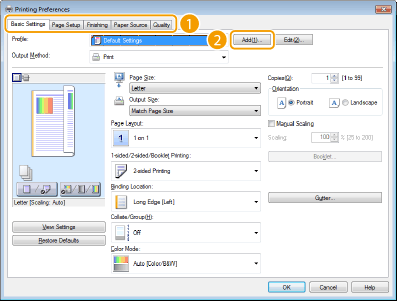 Κάντε κλικ στις καρτέλες [Basic Settings] (Βασικές ρυθμίσεις), [Page Setup] (Ρύθμιση σελίδας), [Finishing] (Τελική επεξεργασία), [Paper Source] (Πηγή χαρτιού) ή [Quality] (Ποιότητα) για να καθορίσετε τις ρυθμίσεις εκτύπωσης σε κάθε οθόνη, όπως απαιτείται.
