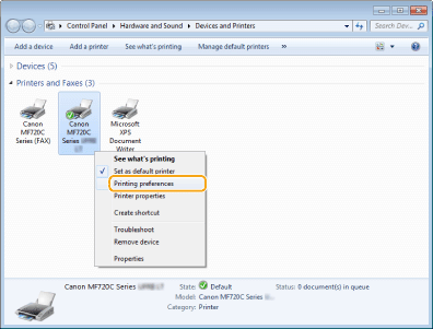 Κάντε δεξί κλικ στο εικονίδιο της συσκευής και επιλέξτε [Printing preferences] (Προτιμήσεις εκτύπωσης).