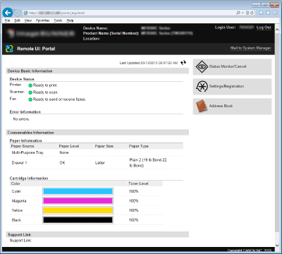 Μπορείτε να χρησιμοποιήσετε όλες τις λειτουργίες και τις ρυθμίσεις του Remote UI (Απομακρυσμένο περιβάλλον εργασίας). Εισαγάγετε τον κατάλληλο κωδικό στο πεδίο [System Manager ID] και τον κωδικό PIN στο πεδίο [System Manager PIN] (