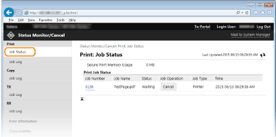 Κάντε κλικ στο [Job Number] στα έγγραφα για τα οποία σταμάτησαν οι εργασίες και τα ασφαλή έγγραφα για να εμφανίσετε λεπτομερείς πληροφορίες. Μπορείτε να ελέγξετε το όνομα χρήστη και τον αριθμό σελίδων του εκτυπωμένου έγγραφου.