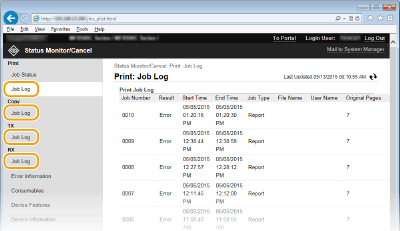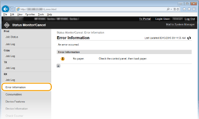 Εάν παρουσιαστεί κάποιο σφάλμα, αυτή η σελίδα θα εμφανιστεί εάν πατήσετε το μήνυμα που βρίσκεται κάτω από την επιλογή [Error Information] στην σελίδα πύλης (κύρια σελίδα).