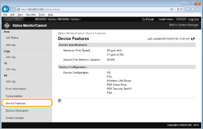 Εμφανίζεται η μέγιστη ταχύτητα εκτύπωσης, η χωρητικότητα της μνήμης ασφαλούς εκτύπωσης και η διαμόρφωση της συσκευής.