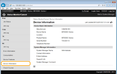 Εμφανίζονται πληροφορίες σχετικά με το μηχάνημα και τον υπεύθυνο συστήματος. Αυτές οι πληροφορίες ρυθμίζονται στο [System Management] στη σελίδα [Settings/Registration].