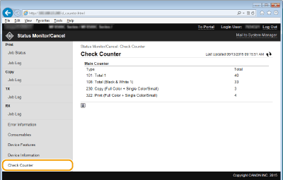 Εμφανίζεται ο συνολικός αριθμός σελίδων που εκτυπώθηκαν με τις λειτουργίες αντιγραφής, εκτύπωσης και φαξ.
