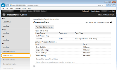 Εμφανίζονται το μέγεθος και ο τύπος του χαρτιού που έχει τοποθετηθεί στην πηγή χαρτιού, ο αριθμός μοντέλου της κασέτας γραφίτη και άλλες πληροφορίες. Μπορείτε επίσης να επιλέξετε [Check Consumables Details] στην