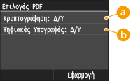 Εάν επιλέξετε <Ορισμός Λεπτομερειών PDF>, μπορείτε να καθορίσετε τις ρυθμίσεις κρυπτογράφησης και ψηφιακής υπογραφής των αρχείων PDF της επιλογής <PDF (Συμπίεση)>, <PDF>, <PDF (Συμπίεση/OCR)> ή <PDF (OCR)>.