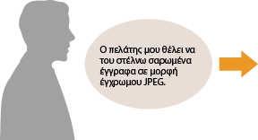 Καθορίστε τη διεύθυνση e-mail του πελάτη σας επιλέγοντας <Χρωματιστό> και <JPEG> ως ρυθμίσεις σάρωσης και καταχωρίστε αυτό το συνδυασμό διεύθυνσης και ρυθμίσεων στην ενότητα <Αγαπημένες Ρυθμίσεις>.Έτσι, θα μπορείτε να χρησιμοποιείτε εύκολα αυτό το συνδυασμό ρυθμίσεων κάθε φορά που τον χρειάζεστε. Καταχώρηση των ρυθμίσεων σάρωσης που χρησιμοποιούνται συχνά (E-mail/I-Fax/Κοινόχρηστος φάκελος/Διακομιστής FTP)