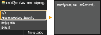 Εάν έχετε επιλέξει το πλαίσιο ελέγχου, θα μπορείτε να επιλέξετε <Η/Υ> ή <Απομακρυσμένος Σαρωτής> στην κύρια οθόνη και να σαρώσετε έγγραφα σε υπολογιστή οποιαδήποτε στιγμή. Εάν δεν έχετε επιλέξει το πλαίσιο ελέγχου, δεν θα μπορείτε να σαρώσετε έγγραφα σε υπολογιστή, εφόσον είναι ενεργοποιημένη η Διαχείριση μέσων κωδικών τμημάτων. Δεν υπάρχει δυνατότητα περιορισμού της σάρωσης εγγράφων σε υπολογιστή με βάση μεμονωμένους κωδικούς τμημάτων.