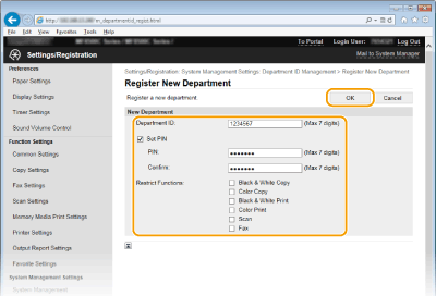 Καταχωρίστε έναν κωδικό τμήματος και ορίστε ένα PIN για αυτόν. Μπορείτε επίσης να απενεργοποιήσετε λειτουργίες, όπως την ασπρόμαυρη αντιγραφή και την έγχρωμη εκτύπωση, για κάθε κωδικό τμήματος. Είναι δυνατή η καταχώριση έως και 300 κωδικών τμημάτων.