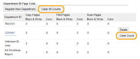 Εάν θέλετε να μηδενίσετε τις μετρήσεις, κάντε κλικ στον αντίστοιχο σύνδεσμο κειμένου στην επιλογή [Department ID] και κάντε κλικ στο [Clear Count]  [OK]. Εάν θέλετε να μηδενίσετε τις μετρήσεις για όλους τους κωδικούς τμημάτων, επιλέξτε [Clear All Counts]  [OK].