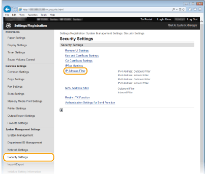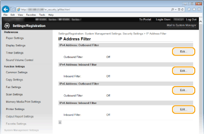 Εάν οι διευθύνσεις IP δεν εισαχθούν σωστά, μπορεί να μην έχετε δυνατότητα πρόσβασης στη συσκευή από το Remote UI (Απομακρυσμένο περιβάλλον εργασίας) και στην περίπτωση αυτή θα πρέπει να ορίσετε τη ρύθμιση <Φίλτρο Δ/νσης IPv4> ή <Φίλτρο Δ/νσης IPv6> στην επιλογή <Off>. Φίλτρο Δ/νσης IPv4 Φίλτρο Δ/νσης IPv6